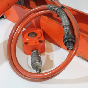 Power Team verkstedpresse, håndpumpe og lavprofil-jekk -Bærer noe preg av bruk, ubetydelig -Verkstespresse og lavprofil-jekk tilknyttes håndpumpen på tvers av